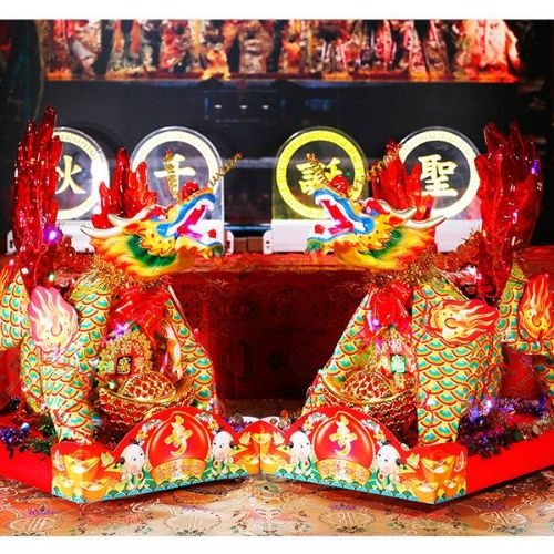 以壽麵、壽桃疊成的「壽桃塔」一對來供獻,在兩座塔旁邊分別掛上紅賀條兩幅,右畫神名、左寫信徒姓名,除了有祝賀神明生日之意,也有為家中添福添壽作用。葳莉「壽桃塔」就是盤桃匯集成塔的意思