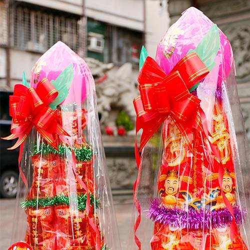 以壽麵、壽桃疊成的「壽桃塔」一對來供獻,在兩座塔旁邊分別掛上紅賀條兩幅,右畫神名、左寫信徒姓名,除了有祝賀神明生日之意,也有為家中添福添壽作用。葳莉「壽桃塔」就是盤桃匯集成塔的意思